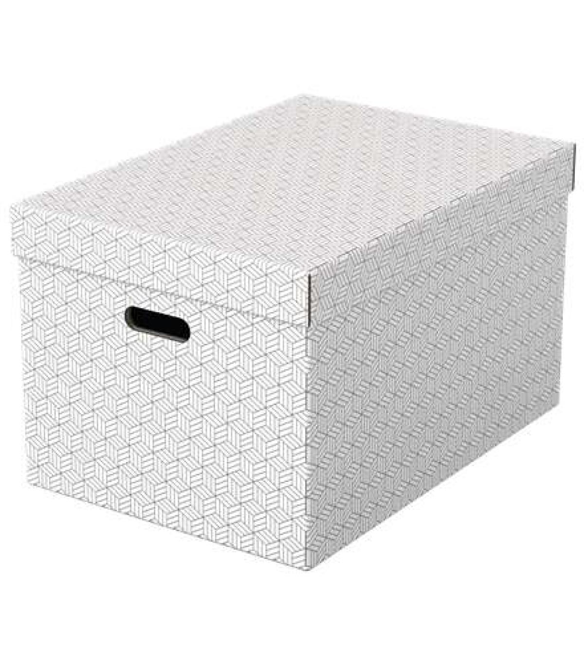 Caja de almacenamiento de cartón moderna y espaciosa con tapa extraíble ideal para crear almacenamiento instantáneo en casa. Juego de tres cajas del mismo tamaño para usar solas o guardar en estanterías y armarios para mantener organizados y fáciles de encontrar elementos como papeleo, libros y juguetes. Cada caja cuenta con 2 asas de transporte integradas para que se pueda transportar fácilmente de una habitación a otra cuando sea necesario. Hecho de cartón corrugado resistente, 100% reciclado y 100% reciclable, certificado FSC. La superficie, que se limpia con un paño, tiene un acabado con un diseño geométrico de dos colores para agregar estilo a tu espacio de almacenamiento. Se suministra en paquete plano y es rápido y fácil de montar. Los lados se pliegan sobre sí mismos durante el montaje para proporcionar el doble de resistencia, asegurando que las cajas se mantengan fuertes y protejan el contenido.