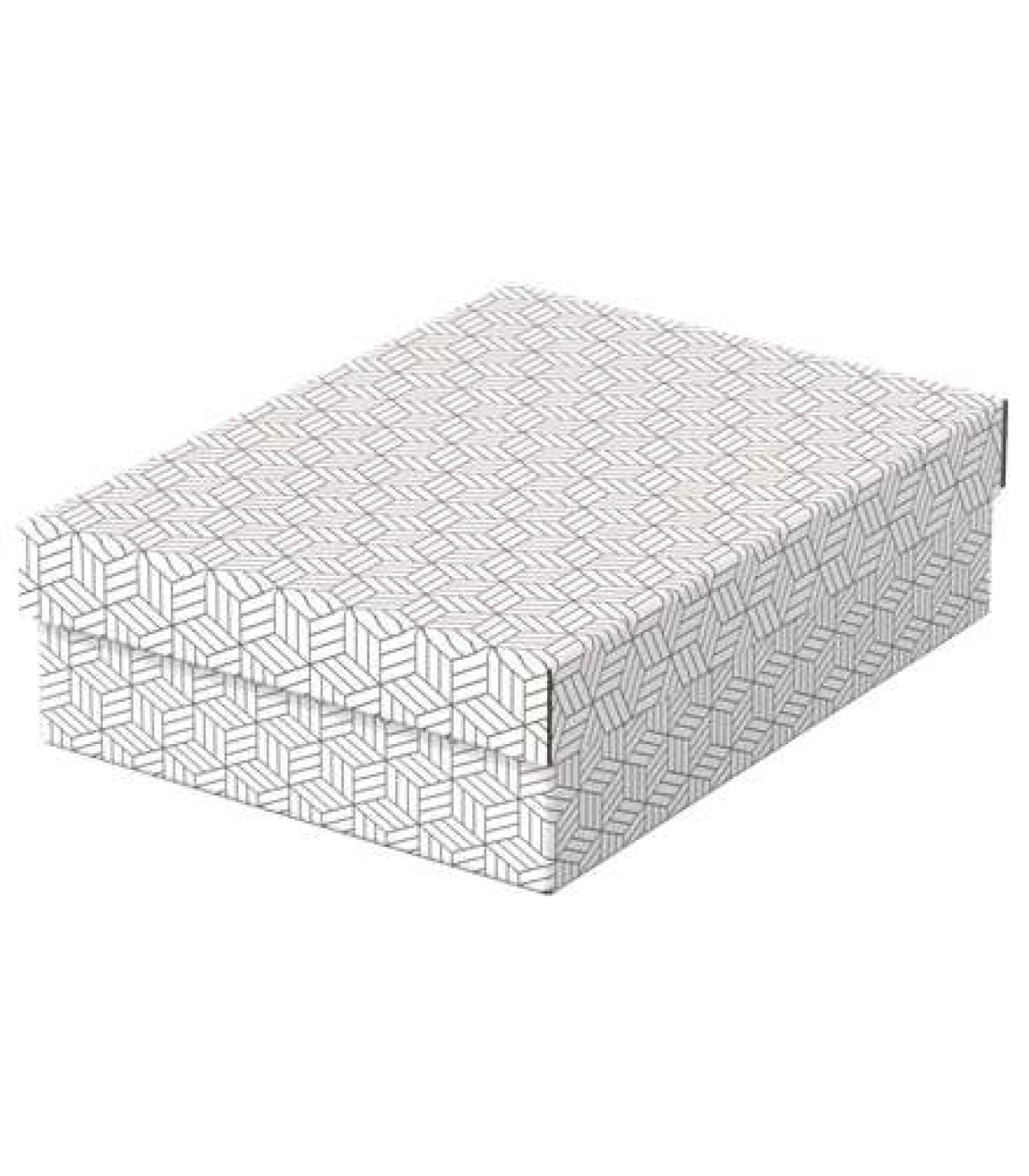 Cajas de almacenamiento de cartón elegantes y modernas con tapa extraíble ideales para empaquetar regalos o crear almacenamiento instantáneo en casa. Juego de tres cajas del mismo tamaño para usar individualmente, para guardar cosas en estantes o crear espacios de almacenamiento todas juntas, para mantener organizados y fáciles de encontrar artículos más pequeños como fotografías y documentos personales. ¡Añádele un poco de cinta y úsala para empaquetar un regalo! Una vez abierto, el destinatario puede reutilizarlo para almacenar artículos en el hogar, así que tienes 2 regalos en uno. Hecho de cartón corrugado resistente, 100% reciclado y 100% reciclable, certificado FSC. La superficie, que se limpia con un paño, tiene un acabado con un diseño geométrico de dos colores para agregar estilo a tu espacio de almacenamiento. Se suministra en paquete plano y es rápido y fácil de montar. Los lados se pliegan sobre sí mismos durante el montaje para proporcionar el doble de resistencia, asegurando que las cajas se mantengan fuertes y protejan el contenido.