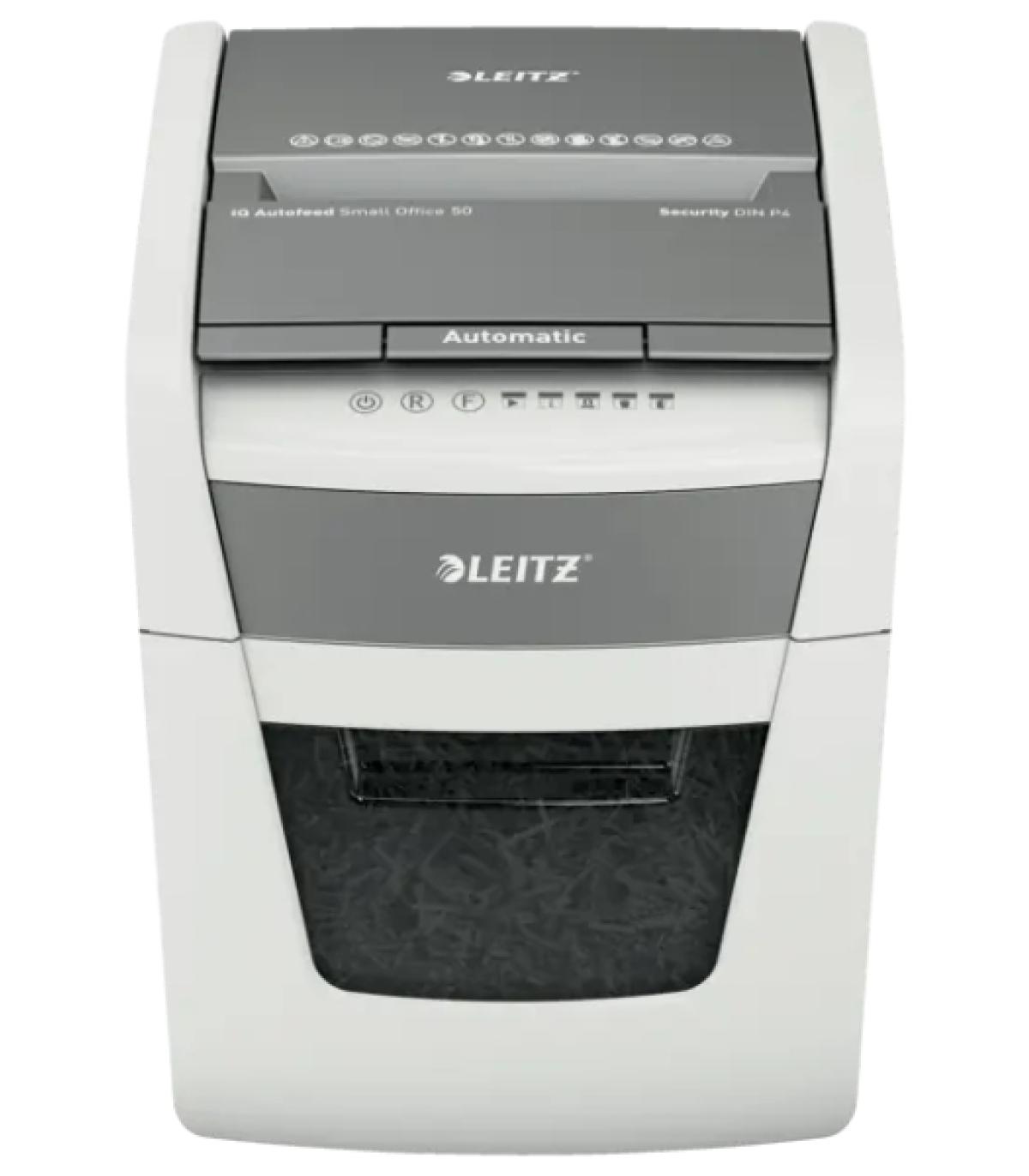 Destructora de papel totalmente automática de Leitz. Tan inteligente que funciona silenciosamente por sí sola, simplemente inserta tu pila de papeles (incluyendo grapas y clips), cierra la tapa y continúa con tu día. Ideal para una oficina pequeña o para la oficina en casa. Seguridad confidencial y excelente rendimiento con esta destructora anti atasco, silenciosa y de larga duración (10 minutos) con alimentación automática. Destruye automáticamente 50 hojas A4 en partículas de seguridad P4 (4x28mm) cortadas de una sola vez en la compacta papelera de 20L. Manejo sencillo mediante controles táctiles.