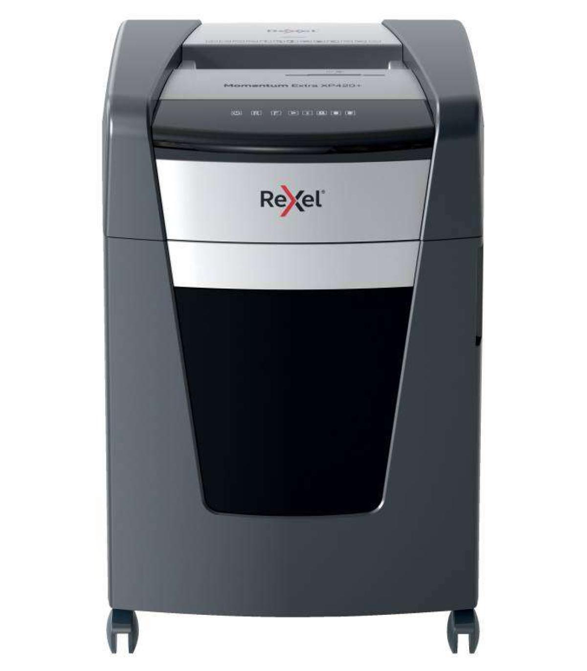 Las destructoras de papel sin atascos Rexel Momentum Extra son ideales para destruir documentos confidenciales en la oficina. La destructora XP420+ destruye hasta 20 hojas de papel A4 (80 grs) de una sola vez a través de la ranura de alimentación manual en partículas P-4 (4x35mm). La tecnología de detección activa mide el número de hojas que se alimentan en tiempo real para detener los atascos y los errores de alimentación del papel, se indica mediante un LED rojo en el panel de control.