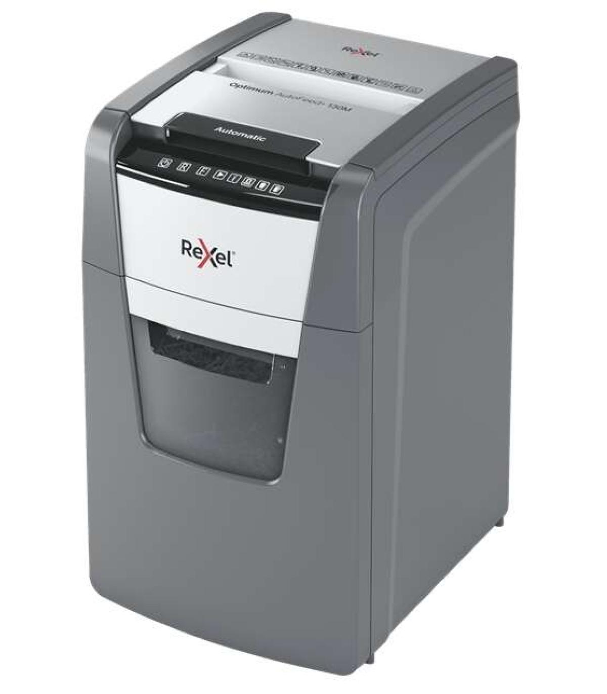 La destructora de microcorte Optimum AutoFeed 130M tritura automáticamente hasta 130 hojas de papel A4 (80 grs.) a la vez, en micro partículas P-5 (2x15 mm). Esta destructora de alimentación automática es una trituradora de oficina sofisticada, con una papelera extraíble de 44 litros. No es necesario alimentar manualmente el papel, ni quitar grapas y clips de papel primero, esta destructora de papel automática hará todo el trabajo por ti.