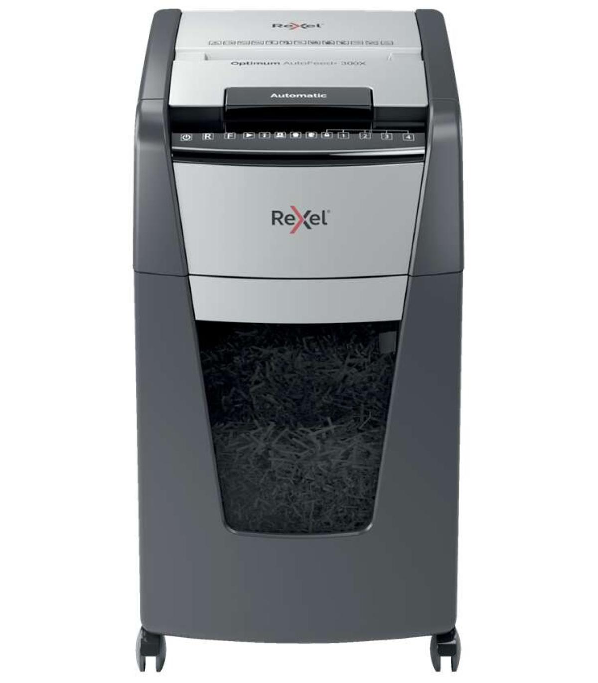 La destructora de corte en partículas Optimum AutoFeed 300X tritura automáticamente hasta 300 hojas de papel A4 (80 grs.) a la vez, en partículas P-4 (4x25 mm). Esta destructora de alimentación automática es una trituradora de oficina sofisticada, con una papelera extraíble de 60 litros. No es necesario alimentar manualmente el papel, ni quitar grapas y clips de papel primero, esta destructora de papel automática hará todo el trabajo por ti.