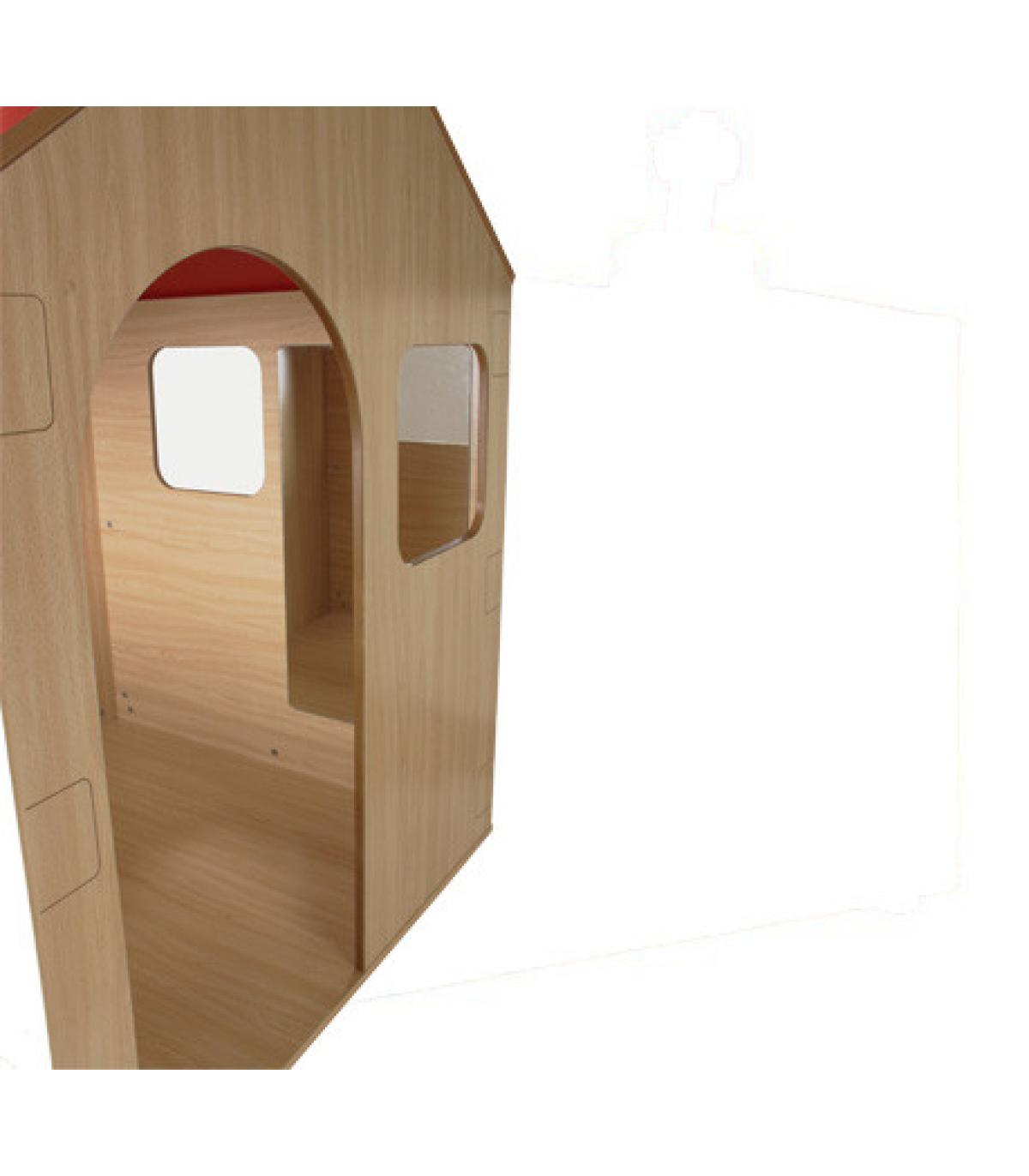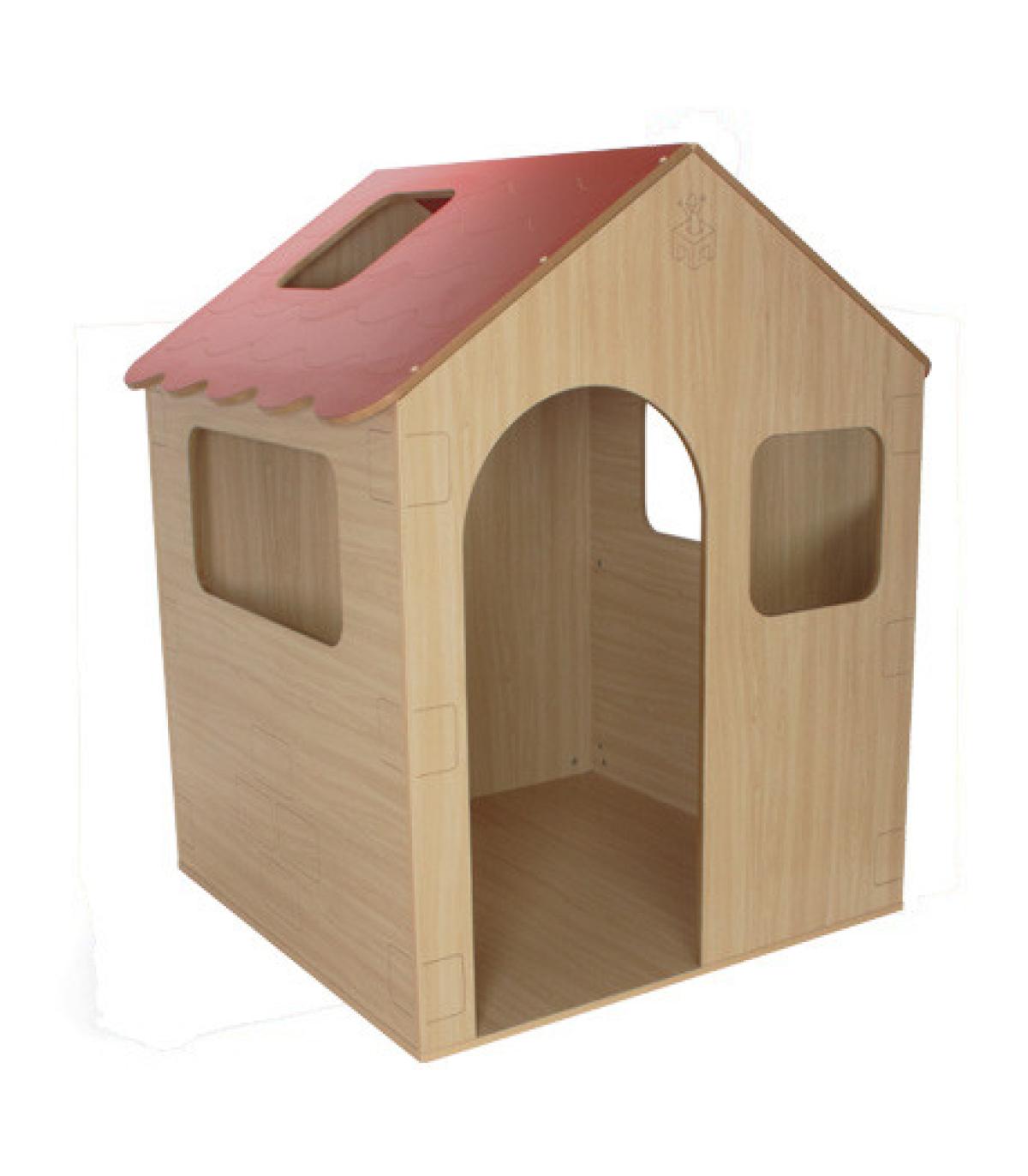 Casita de juegos con puerta y ventanas en todos sus lados, para facilitar la visión de las educadoras de todo el interior desde fuera de la misma interior con espejo, ampliando las posibilidades de juego. Paredes y tejado decorados con ladrillos y simulación tejas, respectivamente. Fabricada en DM melaminizado de 16 mm de grosor con cantos redondeados y barnizados con barniz no tóxico, base en melamina de haya de 19 mm de espesor, con cantos de PVC de 2 mm.Garantizado por los ensayos realizados en centro tecnológico de certificación de mobiliario TECNALIA.