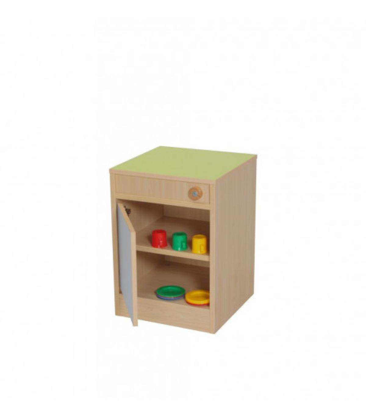 Módulo de juego de imitación cocina (lavavajillas). Con mandos móviles en el frontal simulando los botones de una lavavajillas fabricados en haya maciza. Fabricado en melamina de haya de 19 mm de espesor con cantos en PVC de 2 mm acabados por las dos caras. Encimera y puerta en DM melaminizado de 16 mm de espesor con cantos redondeados y barnizados con barniz no tóxico. Trasera de 10 mm. Puerta interior con bisagras superacodadas y diseño de seguridad antiatrapamiento de dedos.Puertas interiores antiatrapamiento de dedos en su cierre.Garantizado por los ensayos realizados en centro tecnológico de certificación de mobiliario TECNALIA.