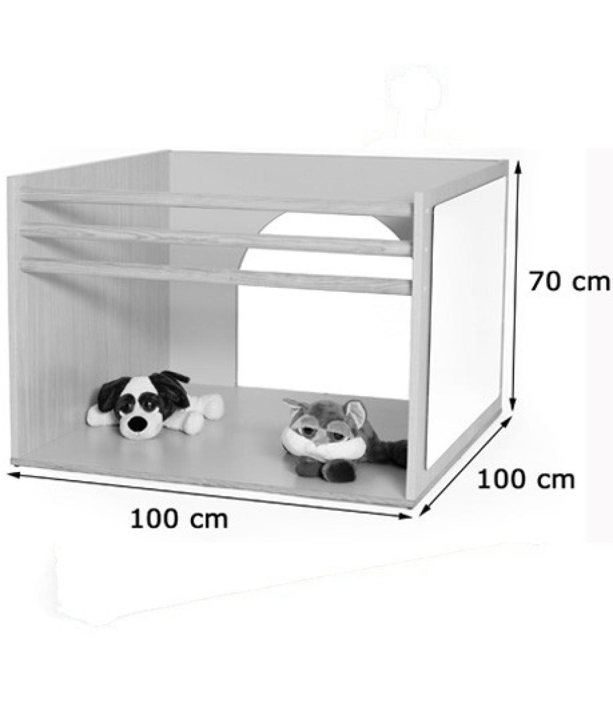 Mueble cubo diseñado para facilitar al niño su motricidad, compuesto de 3 barras de pino macizo (35 mm de sección) barnizadas con barniz no tóxico y espejo de seguridad (3 mm de espesor) con lámina adhesiva, lo que impide el desprendimiento en caso de rotura, y acceso en ambas partes laterales. Fabricado en melamina de 19 mm de espesor. Cantos de PVC de 2 mm acabados por las dos caras. Tablero de DM melaminizado de 16 mm con cantos redondeados y barnizados con barniz no tóxico. Superficie con placa estratificada muy resistente al desgaste.Garantizado por los ensayos realizados en centro tecnológico de certificación de mobiliario TECNALIA.