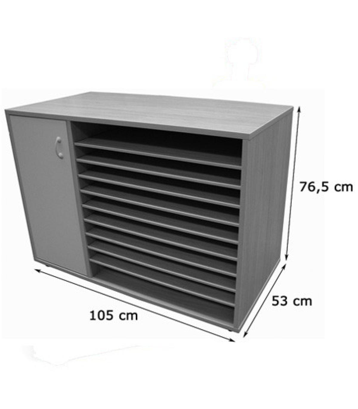 Mueble compuesto por zona armario con 3 estantes en su interior y cartulinero con 10 huecos en posición horizontal. Fabricado en melamina de haya, con tableros de 19 mm de espesor, baldas cartulinero y trasera de 10 mm. Cantos de PVC de 2 mm, acabado por las dos caras. Pies niveladores de PVC de 4 cm de diámetro, con opción de dos alturas (4 y 8 cm), para evitar la humedad y desniveles que pueda tener el suelo.Se puede incorporar cerradura a todos los muebles, tanto para puertas individuales como para parejas, con la misma llave para todo un aula o con llaves diferentes en taquillas.Garantizado por los ensayos realizados en centro tecnológico de certificación de mobiliario TECNALIA.
