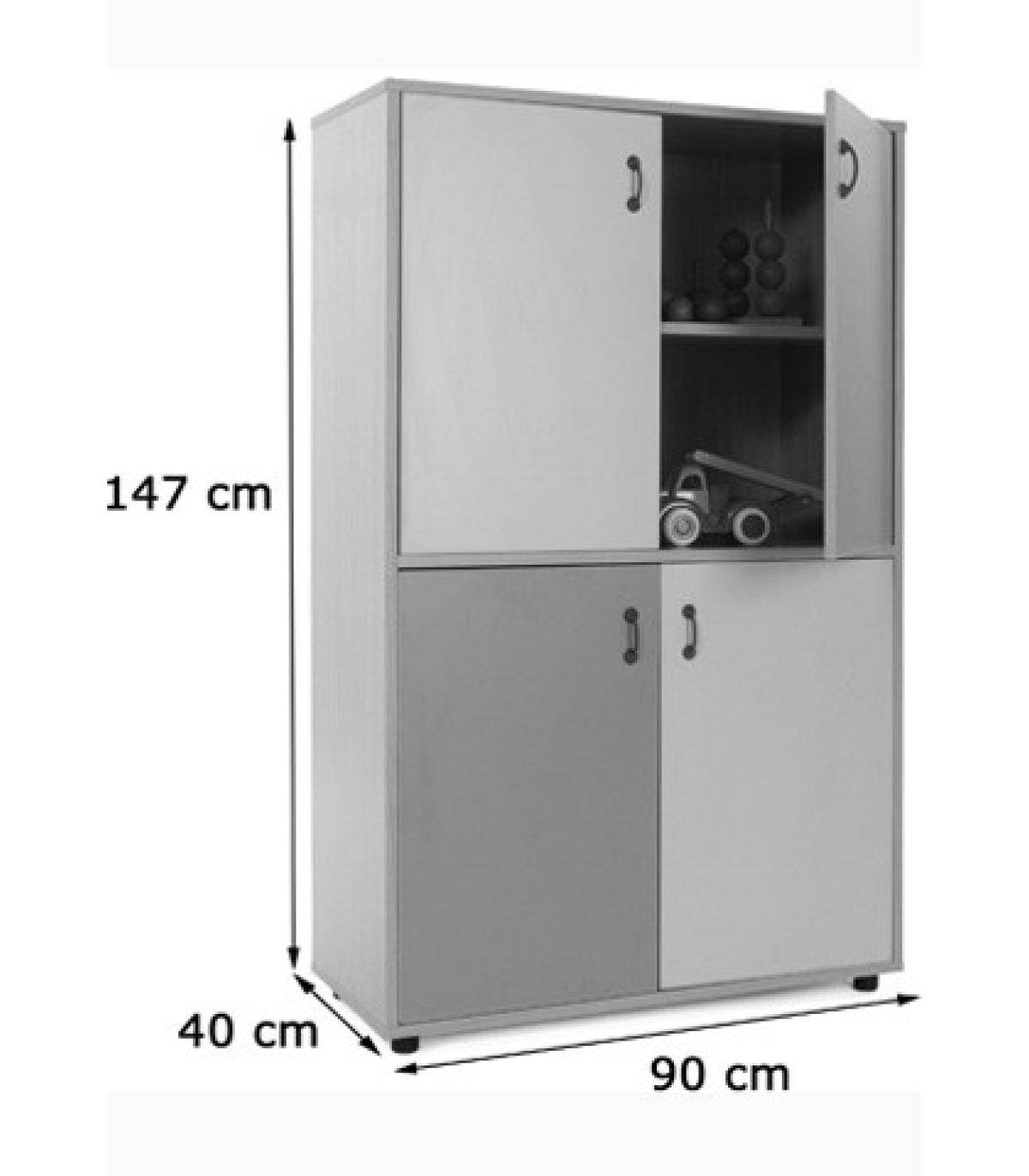 Mueble armario con 4 puertas y 4 estantes, fabricado en melamina de haya de 19 mm de grosor, excepto trasera de 10 mm. Cantos de PVC de 2 mm acabados por las dos caras. Pies niveladores de PVC de 4 cm de diámetro y 4 cm de altura, para evitar la humedad y desniveles que pueda tener el suelo. Estos pies pueden ser retirados para poder superponer sobre diferentes armarios, o bien ser sustituidos por ruedas con freno de 6 cm de altura.Puertas interiores antiatrapamiento de dedos en su cierre y tiradores de polímero suave goma antigolpes.Garantizado por los ensayos realizados en centro tecnológico de certificación de mobiliario TECNALIA.Posibilidad de incorporar cerradura a todos los muebles, tanto para puertas individuales como para parejas, con la misma llave para todo un aula o con llaves diferentes en taquillas.