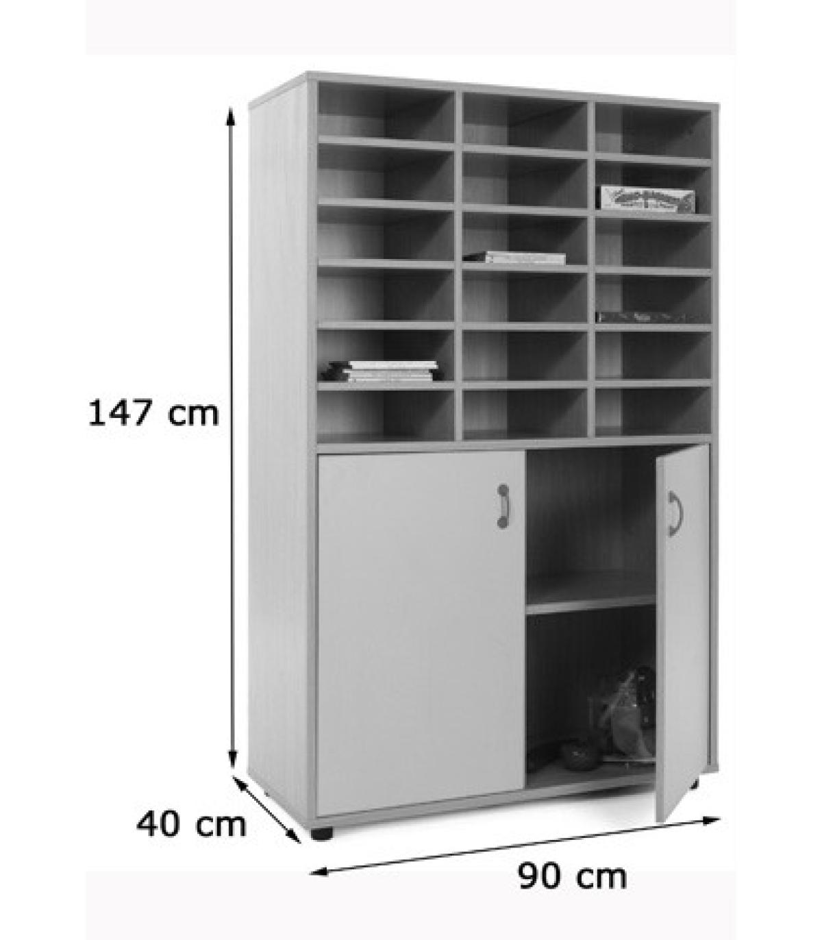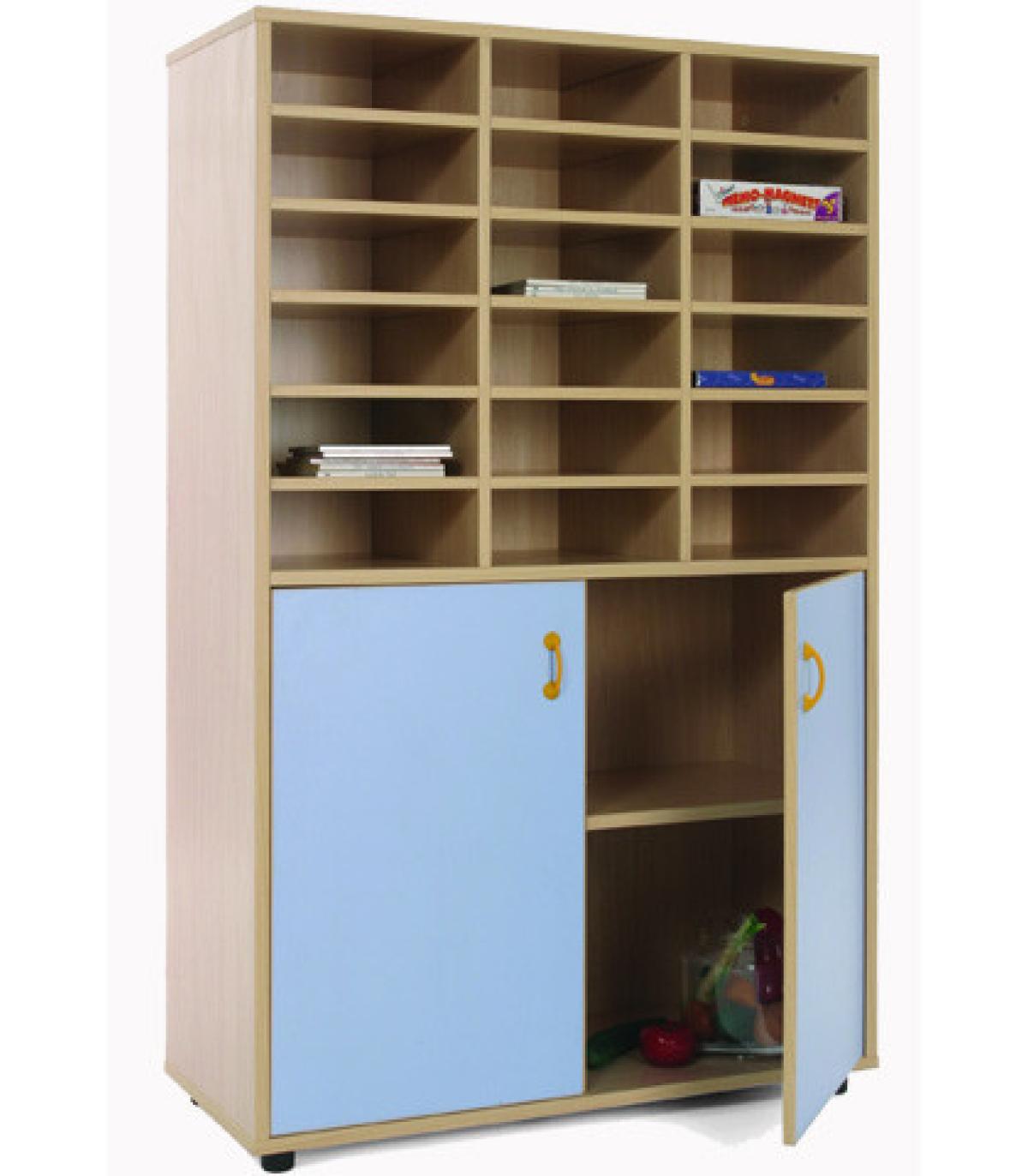 Mueble compuesto por armario inferior de 4 casillas y casillero con 18 casillas en la parte superior, fabricado en melamina de haya de 19 mm de grosor, excepto trasera de 10 mm. Cantos de PVC de 2 mm acabados por las dos caras. Pies niveladores de PVC de 4 cm de diámetro y 4 cm de altura, para evitar la humedad y desniveles que pueda tener el suelo. Estos pies pueden ser retirados para poder superponer sobre diferentes armarios, o bien ser sustituidos por ruedas con freno de 6 cm de altura.Puertas interiores antiatrapamiento de dedos en su cierre y tiradores de polímero suave goma antigolpes.Garantizado por los ensayos realizados en centro tecnológico de certificación de mobiliario TECNALIA.Posibilidad de incorporar cerradura a todos los muebles, tanto para puertas individuales como para parejas, con la misma llave para todo un aula o con llaves diferentes en taquillas.