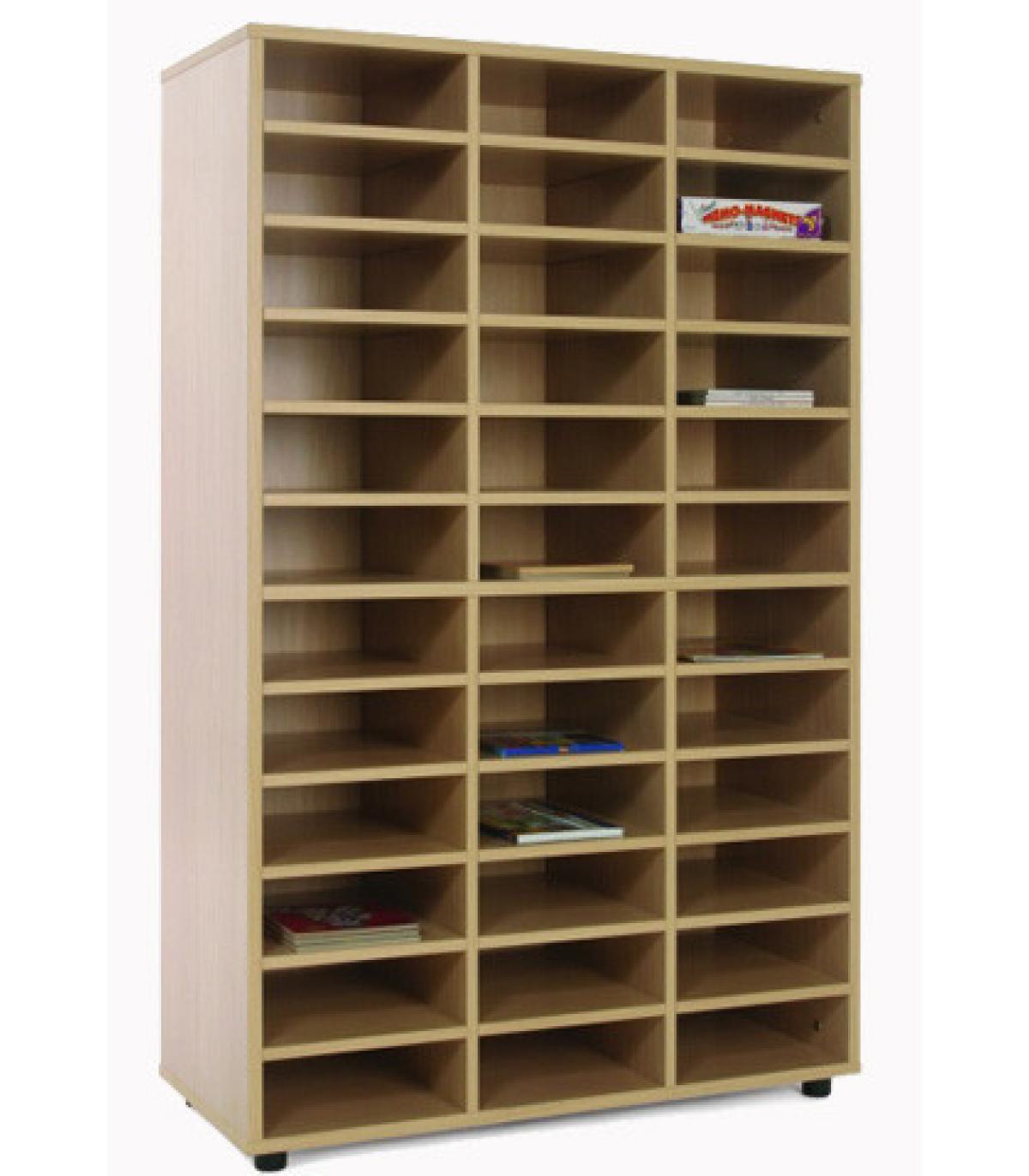 Mueble casillero de 36 casillas, fabricado en melamina de haya de 19 mm de grosor, excepto trasera de 10 mm. Cantos de PVC de 2 mm acabados por las dos caras. Pies niveladores de PVC de 4 cm de diámetro y 4 cm de altura, para evitar la humedad y desniveles que pueda tener el suelo. Estos pies pueden ser retirados para poder superponer sobre diferentes armarios, o bien ser sustituidos por ruedas con freno de 6 cm de altura.Garantizado por los ensayos realizados en centro tecnológico de certificación de mobiliario TECNALIA.