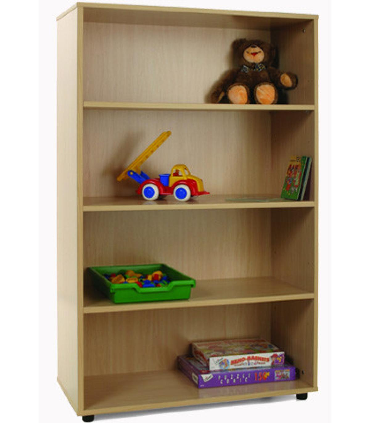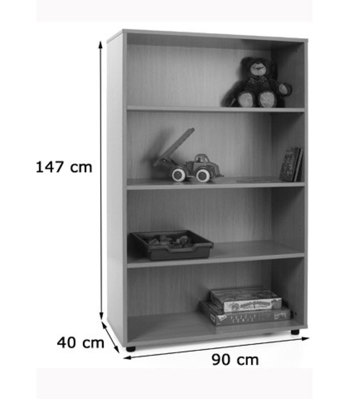 Mueble estantería con 4 estantes, fabricado en melamina de haya de 19 mm de grosor, excepto trasera de 10 mm. Cantos de PVC de 2 mm acabados por las dos caras. Pies niveladores de PVC de 4 cm de diámetro y 4 cm de altura, para evitar la humedad y desniveles que pueda tener el suelo. Estos pies pueden ser retirados para poder superponer sobre diferentes armarios, o bien ser sustituidos por ruedas con freno de 6 cm de altura. Garantizado por los ensayos realizados en centro tecnológico de certificación de mobiliario TECNALIA.