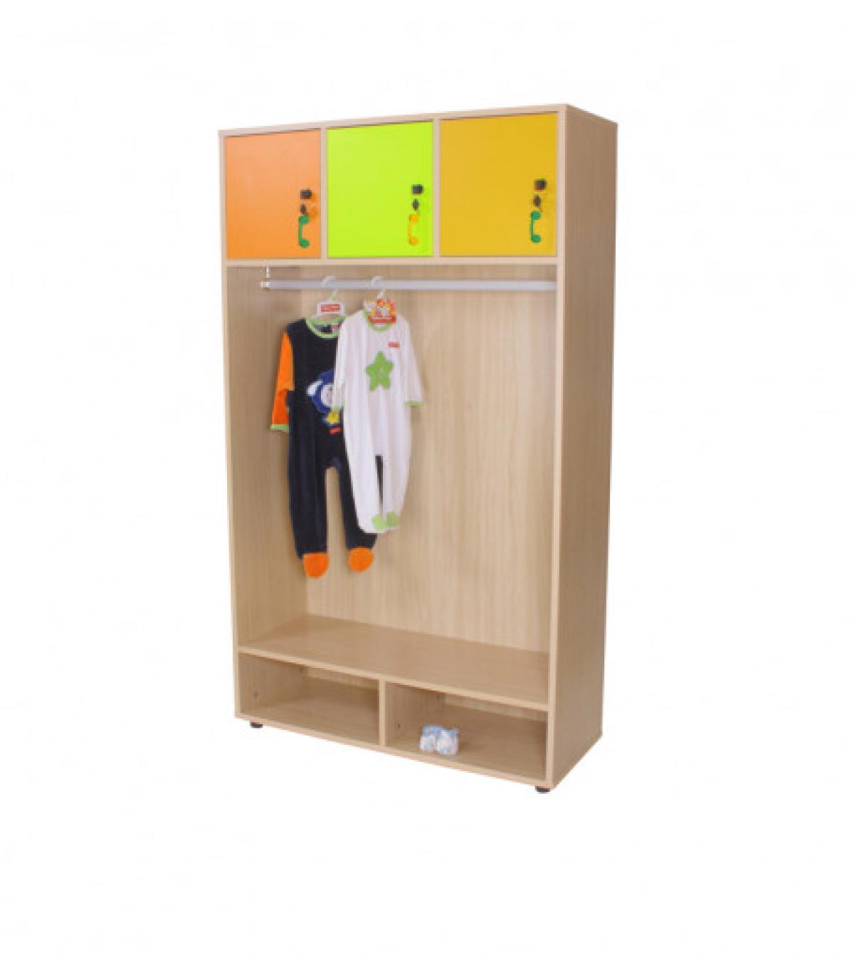 Perchero abierto con barra central con sistema anticaída. Con tres puertas superiores con cerradura para guardar objetos personales y dos casillas bajas para zapatos, que a su vez servirá de banco para los más pequeños. Fabricado en melamina de haya, con tableros de 19 mm de espesor, excepto trasera de 10 mm puertas de 16 mm y cantos de PVC de 2 mm, acabado por las dos caras. Pies niveladores de PVC de 4 cm de diámetro, con opción de dos alturas (4 y 8 cm), para evitar la humedad y desniveles que pueda tener el suelo.Puertas interiores antiatrapamiento de dedos en su cierre y tiradores de polímero suave goma antigolpes.Garantizado por los ensayos realizados en centro tecnológico de certificación de mobiliario TECNALIA.