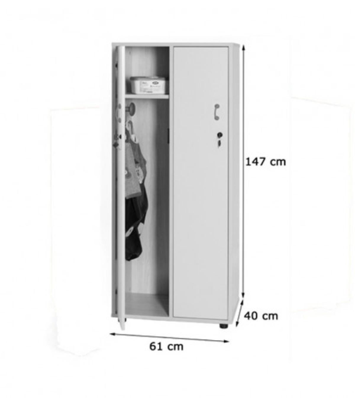 Mueble conjunto de 2 taquillas individuales con balda y una percha por taquilla, fabricado en melamina de haya, con tableros de 19 mm de espesor excepto trasera de 10 mm. Cantos de PVC de 2mm acabados por las dos caras. Pies niveladores de PVC de 4 cm de diámetro, con opción de dos alturas (4 y 8 cm), para evitar la humedad y desniveles que pueda tener el suelo. Perchas interiores de colores a elegir fabricadas en polipropileno con aristas redondeadas y sistema de doble colgador.Puertas interiores antiatrapamiento de dedos en su cierre y tiradores de polímero suave goma antigolpes.Cada puerta dispone de cerradura individualizada con 2 llaves incluidas. Estas cerraduras pueden ser abiertas con una llave maestra.Garantizado por los ensayos realizados en centro tecnológico de certificación de mobiliario TECNALIA.
