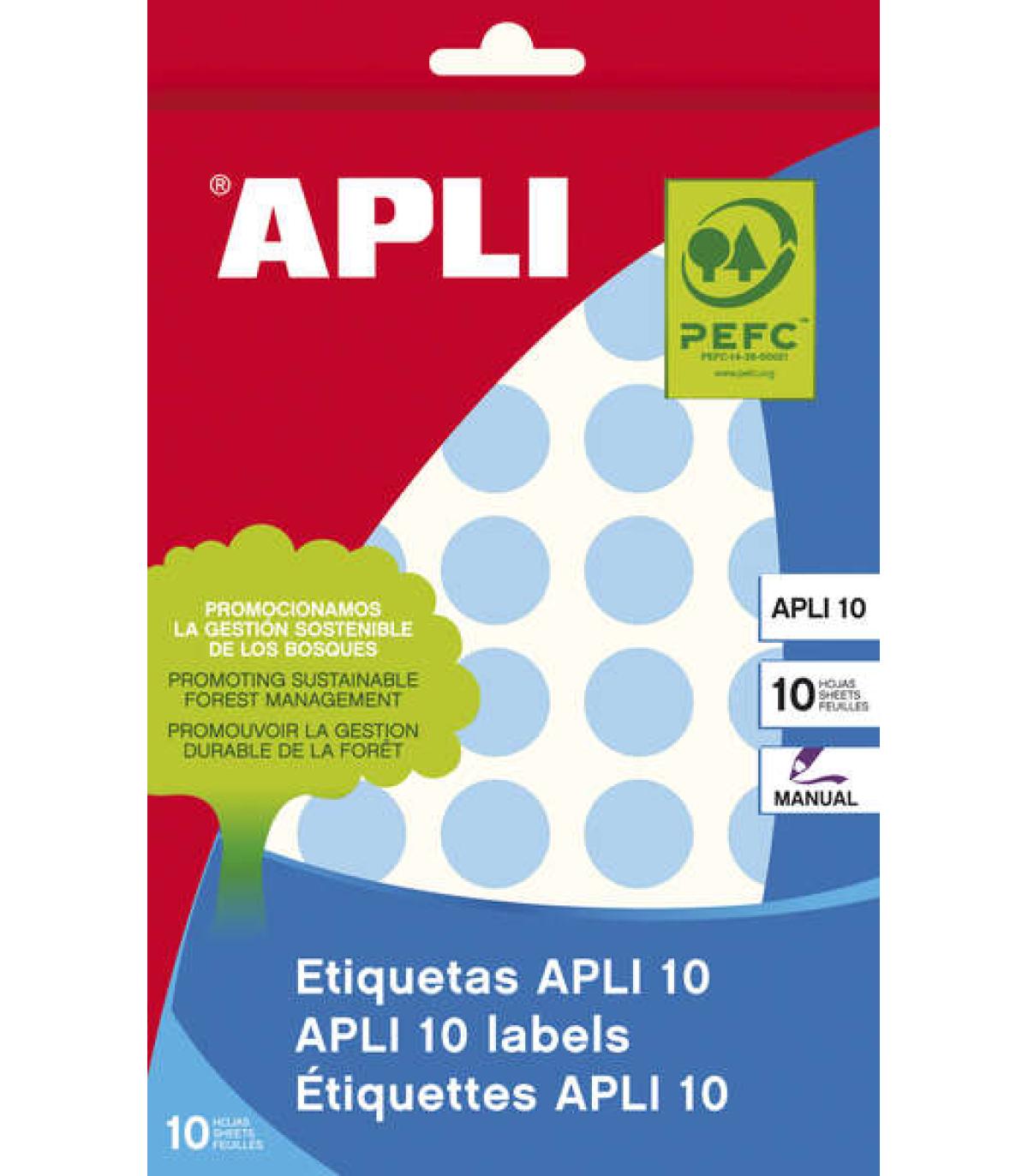 Etiquetas azules circulares en formato APLI 10, tamaño Ø 19,0 mm con adhesivo permanente. Este pack incluye 8 hojas, lo que equivale a 320 etiquetas. Estas etiquetas son ideales para un etiquetado rápido y efectivo sin necesidad de pasar por la impresora. Además, son perfectas para escribir sobre ellas con lápiz, bolígrafo (incluso tinta gel) o rotulador, permitiendo un rápido secado de la tinta. Son aptas para escritura manual y su adhesivo permanente asegura una fijación duradera.