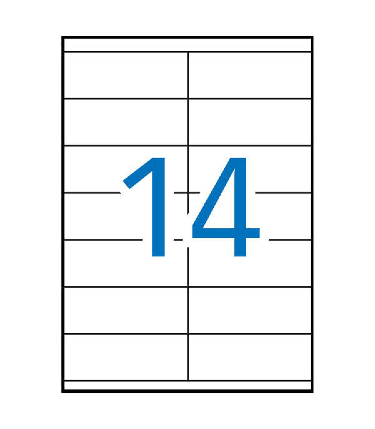 Etiquetas blancas cantos rectos de tamaño 105,0 x 40,0 mm con adhesivo permanente para múltiples usos. Este pack incluye 500 hojas, lo que equivale a 7.000 etiquetas. Son perfectas para identificar envíos de correspondencia, objetos, paquetería o para clasificar.