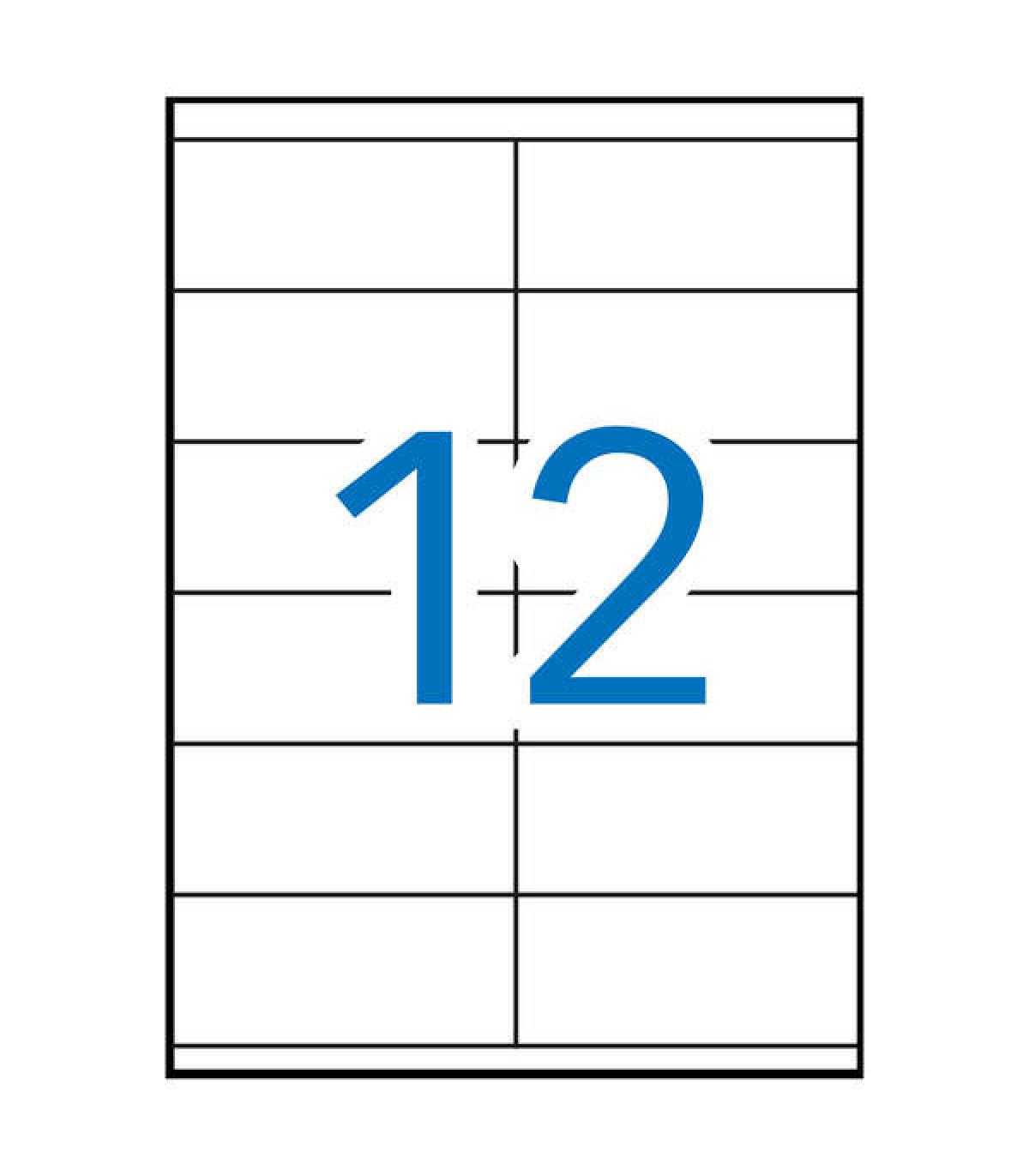Etiquetas blancas cantos rectos de tamaño 105,0 x 48,0 mm con adhesivo permanente para múltiples usos. Perfectas para identificar envíos de correspondencia, objetos, paquetería o para clasificar. Este pack incluye 500 hojas (6.000 etiquetas).