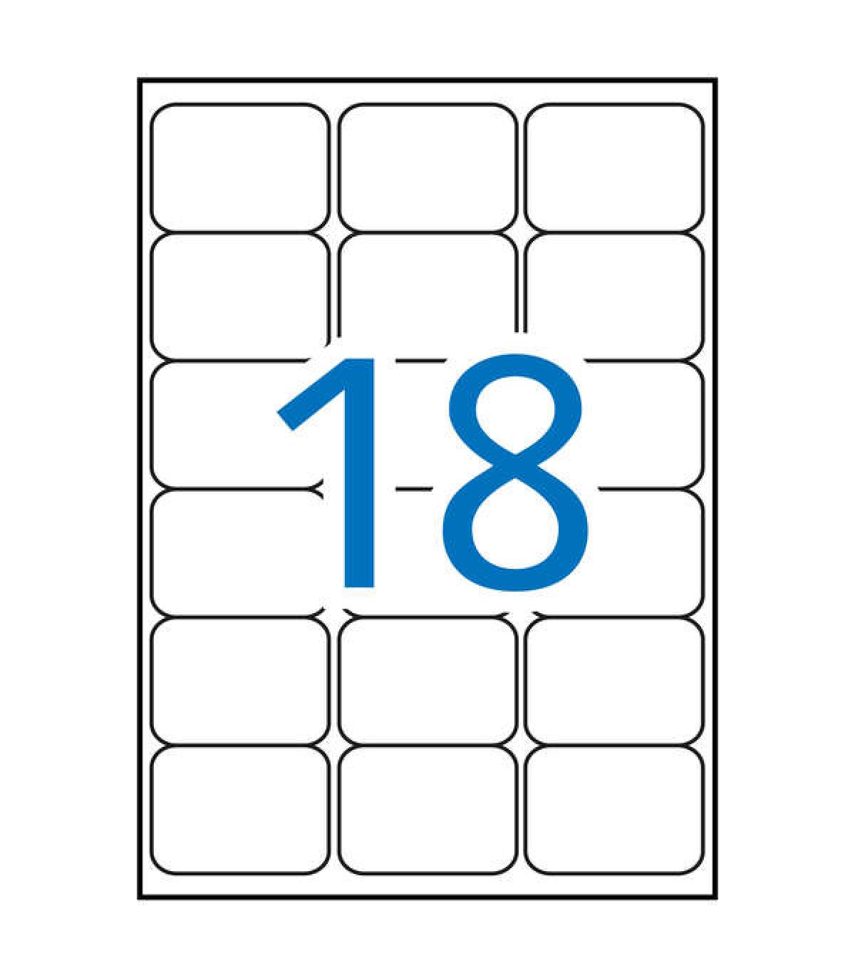 Etiquetas blancas cantos romos de tamaño 63,5 x 46,6 mm con adhesivo permanente para múltiples usos. Este pack incluye 100 hojas, lo que equivale a 1.800 etiquetas. Son ideales para identificar envíos de correspondencia, objetos, paquetería o para clasificar. Además, ofrecen una excelente calidad de impresión en impresoras inkjet, láser o fotocopiadoras.