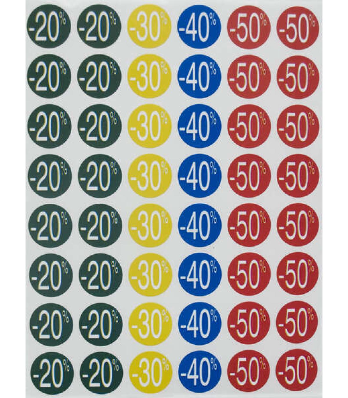 - El pack incluye 80 etiquetas de color verde para el -20%, 40 etiquetas de color amarillo para el -30%, 40 etiquetas de color azul para el -40% y 80 etiquetas de color rojo para el -50%.