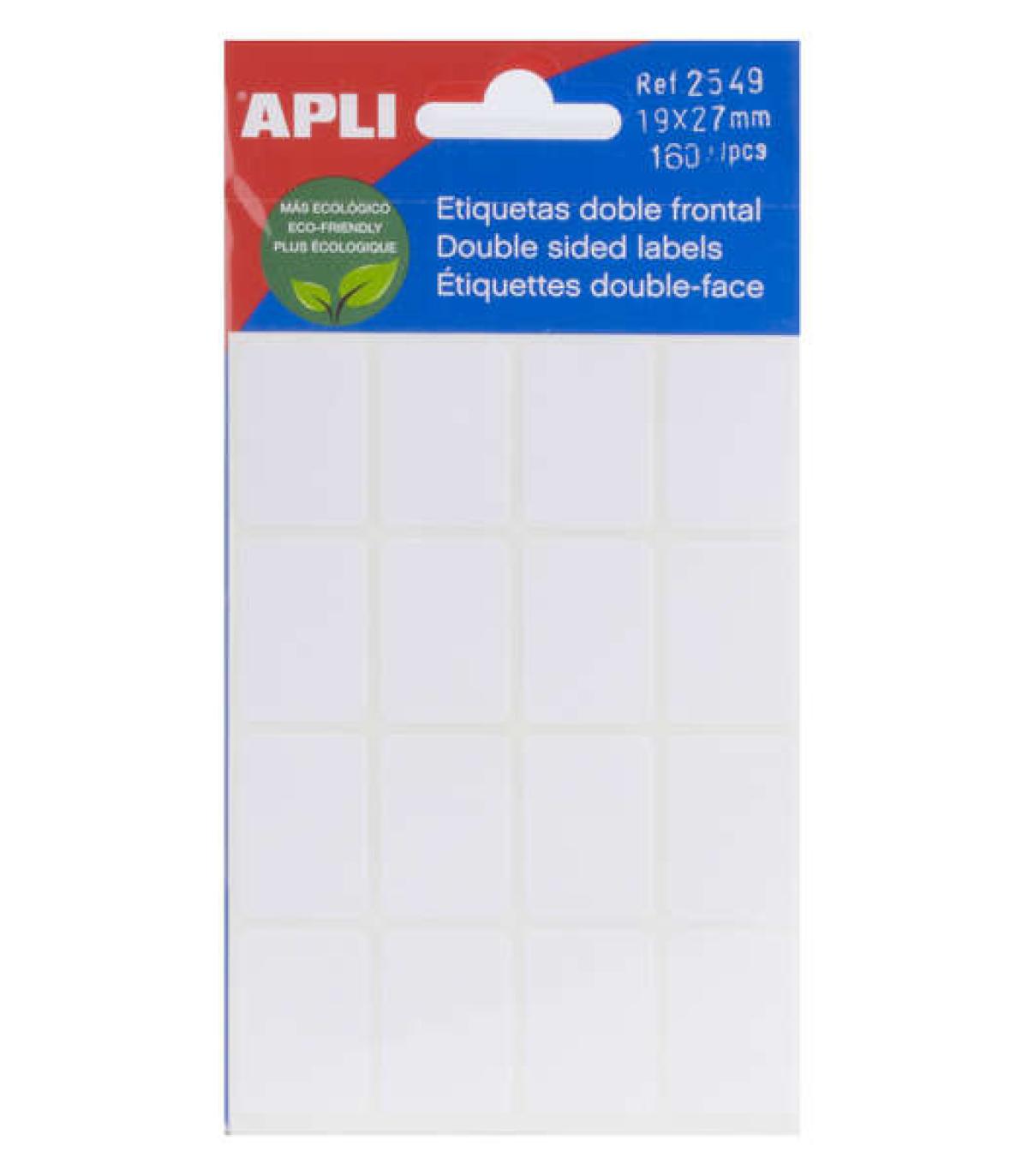 Etiquetas doble frontal en color blanco, cantos romos y tamaño 19,0 x 27,0 mm con adhesivo permanente.