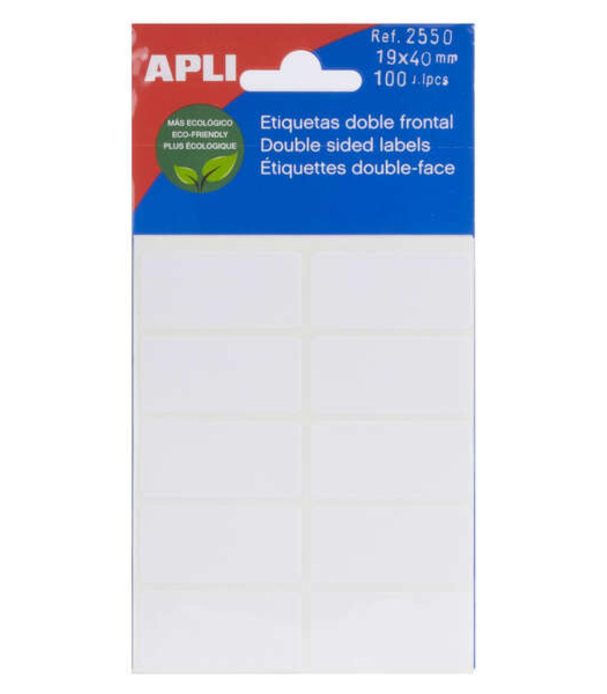 Etiquetas doble frontal en color blanco, cantos romos y tamaño 19,0 x 40,0 mm con adhesivo permanente.