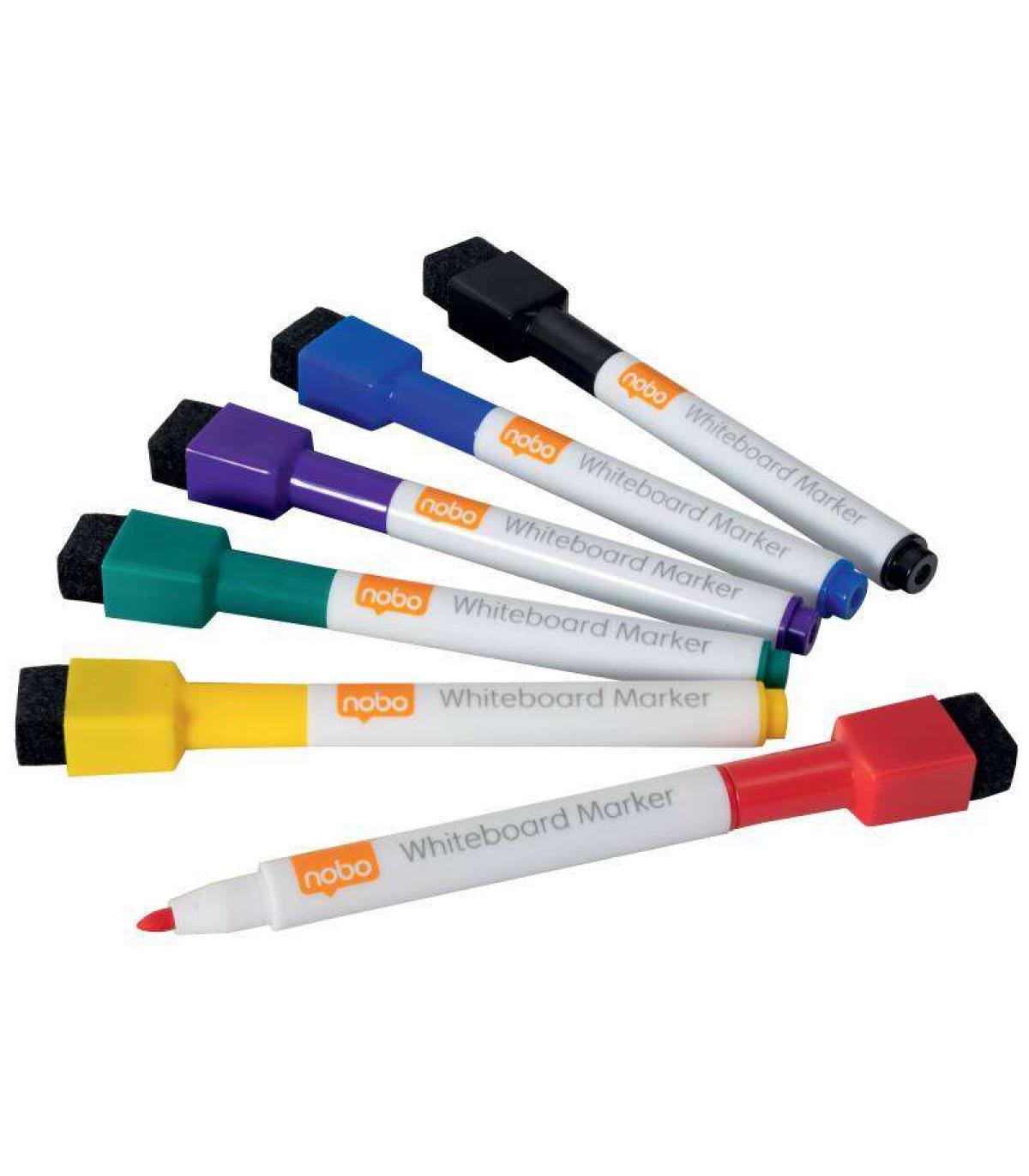 El Mini rotulador para pizarra blanca Nobo con tapa de borrador magnética es un producto ideal para su uso en pizarras blancas. Con una gran visibilidad en las pizarras, este paquete de 6 rotuladores de borrado en seco ofrece una variedad de colores surtidos para resaltar la información en la pizarra.