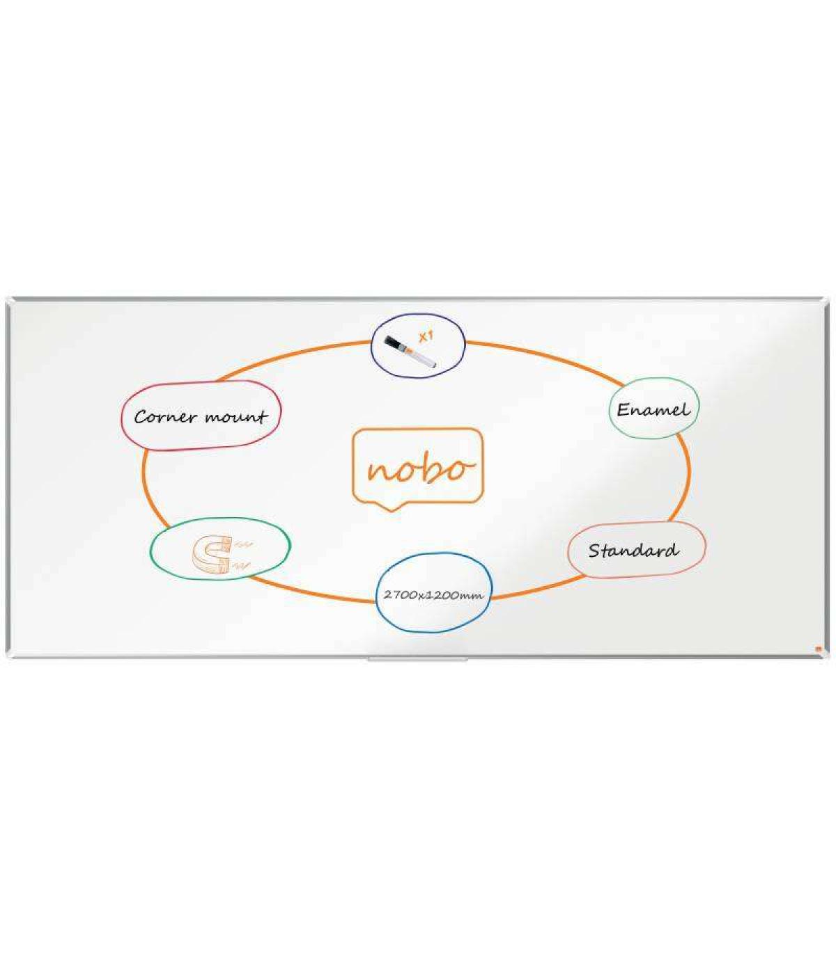 La pizarra magnética de acero vitrificado Nobo Premium Plus de 2700x1200mm es una opción ideal para aquellos que buscan una superficie de alta calidad para escribir y presentar información de manera efectiva.