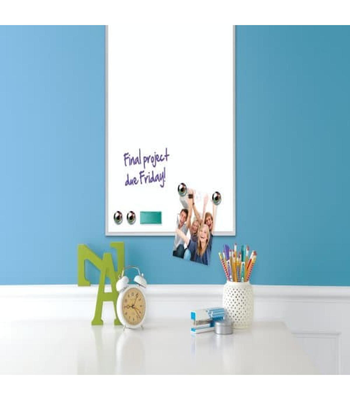 Esta pizarra magnética es el complemento perfecto para cualquier oficina en el hogar o espacio familiar con su superficie para limpiar en seco y su elegante marco de aluminio. Se puede montar en la pared con almohadillas adhesivas que se pueden colocar en orientación vertical u horizontal. Es el tablero de notas perfecto para planificar, anotar recordatorios o ideas. Se suministra con 2 rotuladores para pizarra, 4 imanes para pizarra, almohadillas adhesivas de montaje y un borrador de pizarra compacto en una variedad de colores para que puedas estar seguro de que el color que recibas complementará tu pizarra de borrado en seco. Tamaño: 585x430mm.