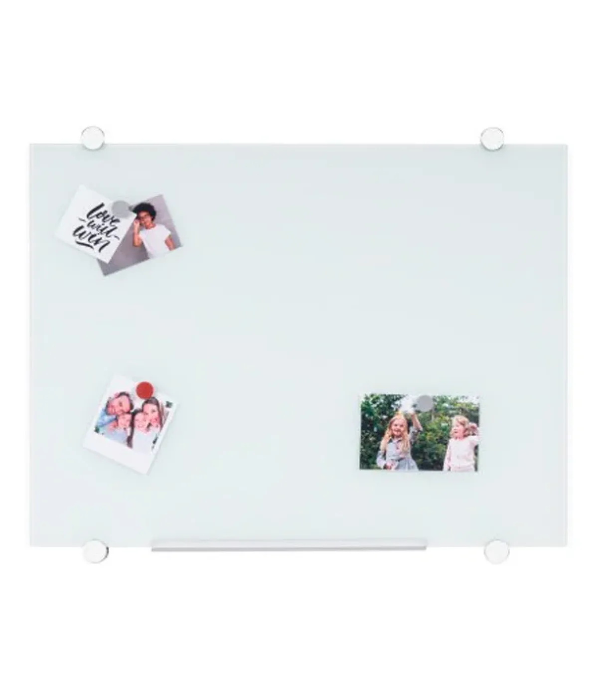 La pizarra de vidrio magnético para escritura con rotuladores de borrado en seco no tiene marco. Cuenta con una superficie de vidrio templado de 4 mm y bordes rectos, junto con un innovador sistema de montaje de acero inoxidable. Se puede colgar en posición horizontal o vertical gracias a su sujeción sin marco. Accesorios incluidos: 1 rotulador, 1 borrador, 2 imanes, bandeja portaobjetos y kit de fijación a la pared.
