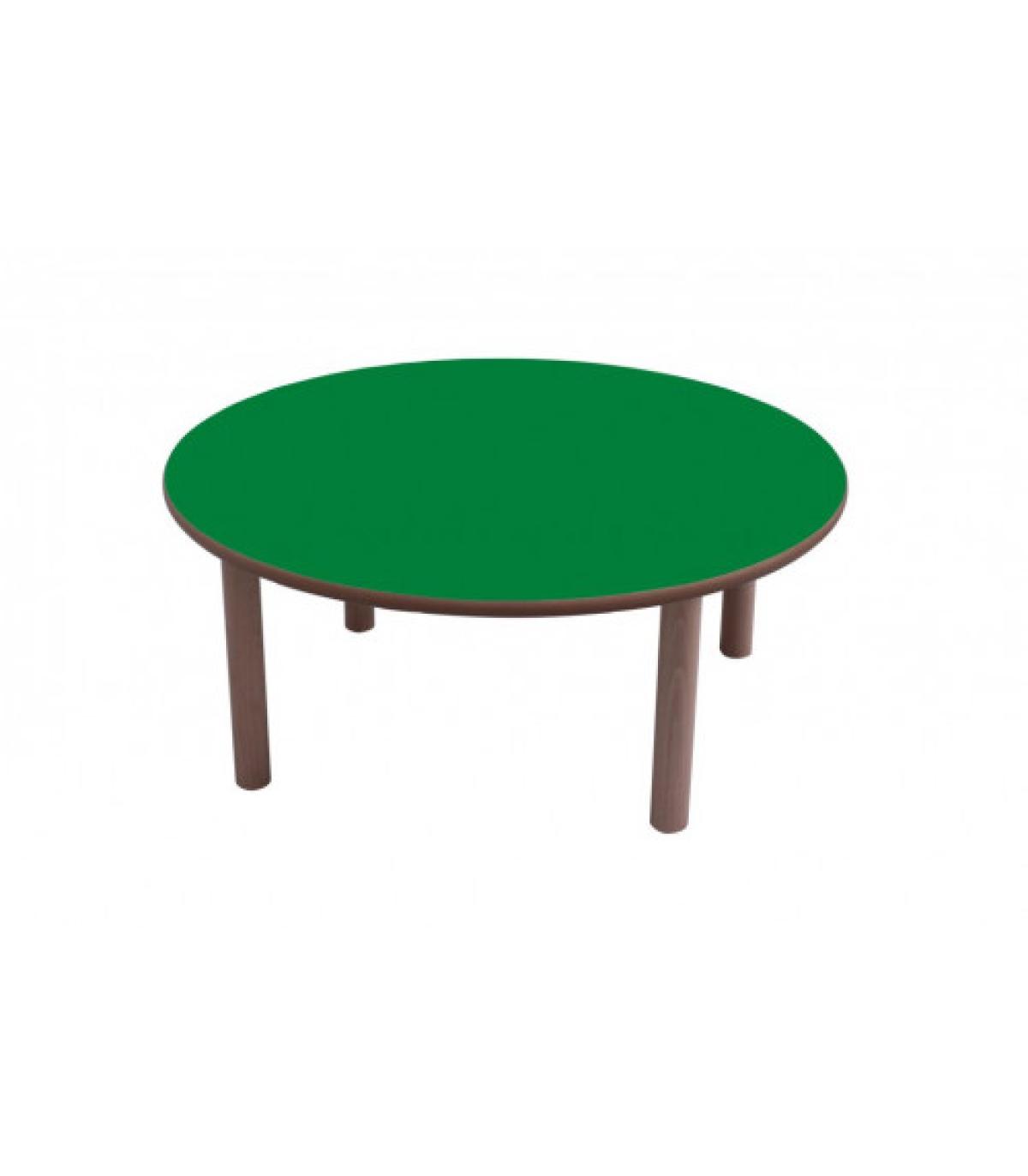 Mesa infantil redonda compuesta por cuatro patas de madera de haya de Ø50 mm con acabado en barniz no tóxico y una encimera en forma circular fabricada en tablero MDF (DM) de 21 mm de espesor, con cantos redondeados barnizados en barniz no tóxico. Superficie y contratiro de la encimera laminadas con planchas de alta presión (HPL), muy resistentes al desgaste.Incorpora conteras de silicona para evitar el rozamiento directo con el suelo.Íntegramente desmontable, reduciendo así el impacto ambiental en su transporte.Garantizado por los ensayos realizados en centro tecnológico de certificación de mobiliario TECNALIA.
