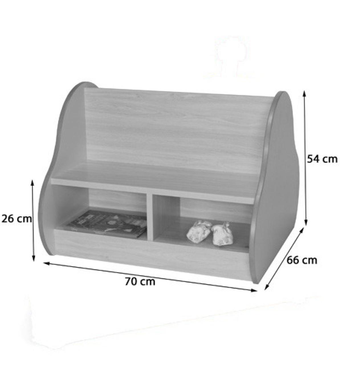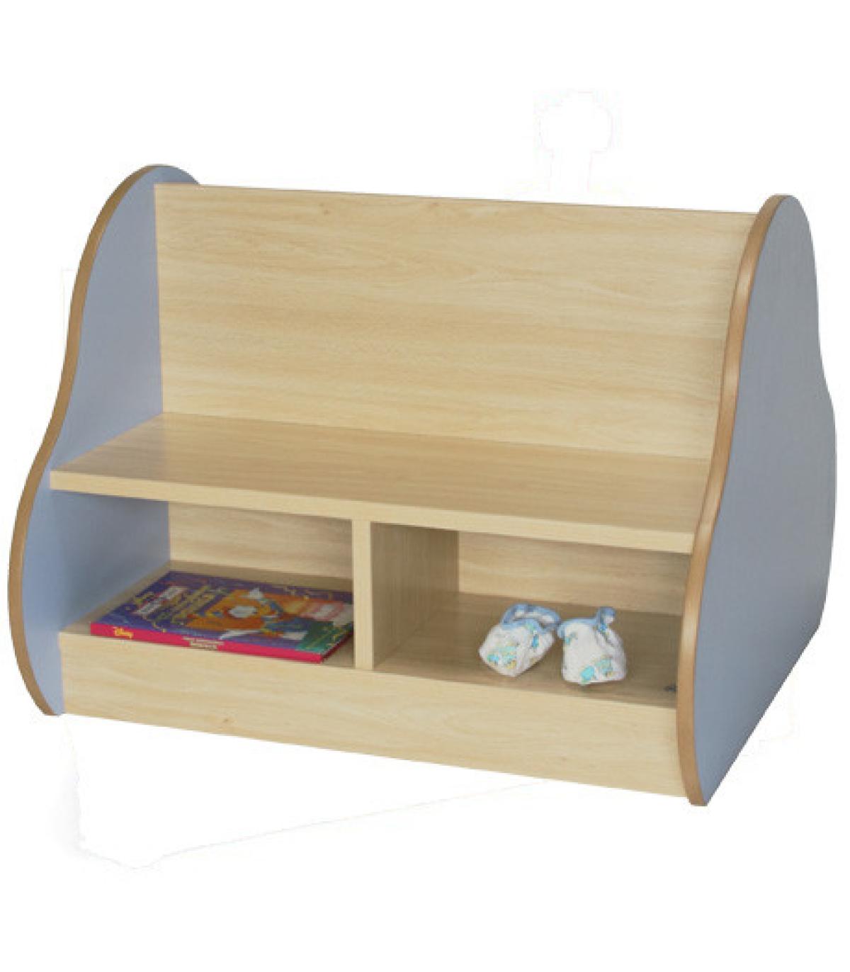 Banco de dos caras con 2 plazas y dos casillas bajo el asiento, para que los niños puedan guardar sus libros y juegos, en cada lado, fabricado en melamina de haya, con tableros de 19 mm de espesor y cantos de PVC de 2 mm, acabado por las dos caras. Costados decorativos de DM melaminizado de 16 mm de grosor con cantos redondeados y barnizados con barniz no tóxico.Garantizado por los ensayos realizados en centro tecnológico de certificación de mobiliario TECNALIA.