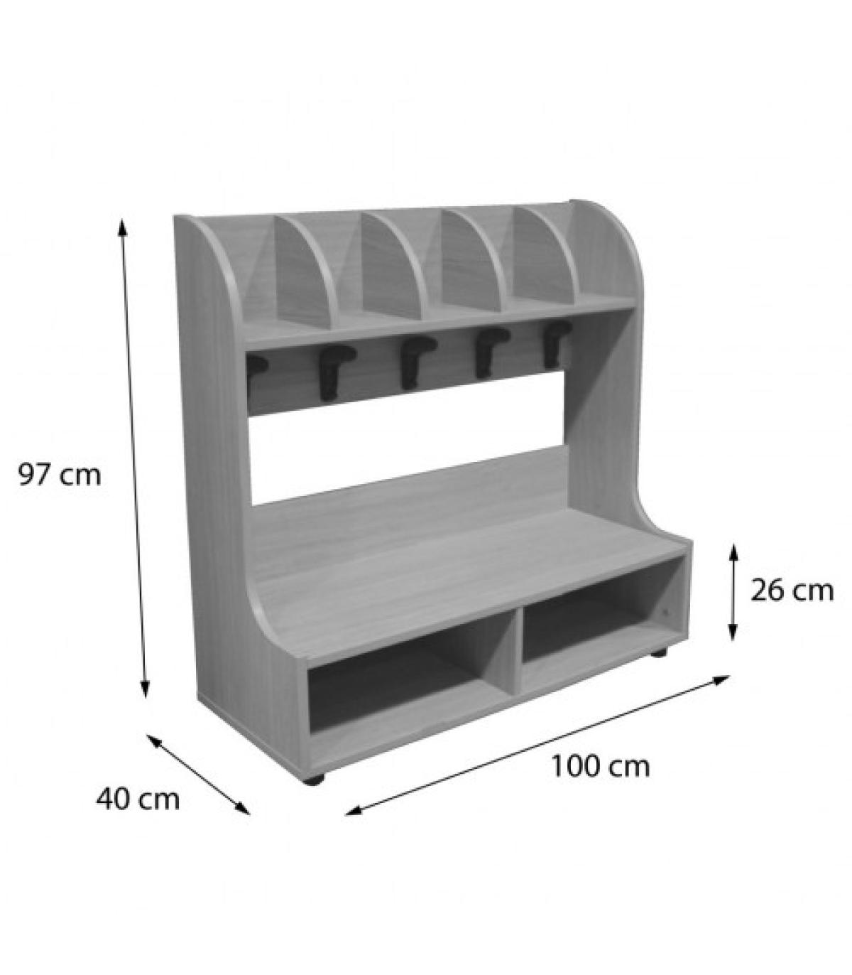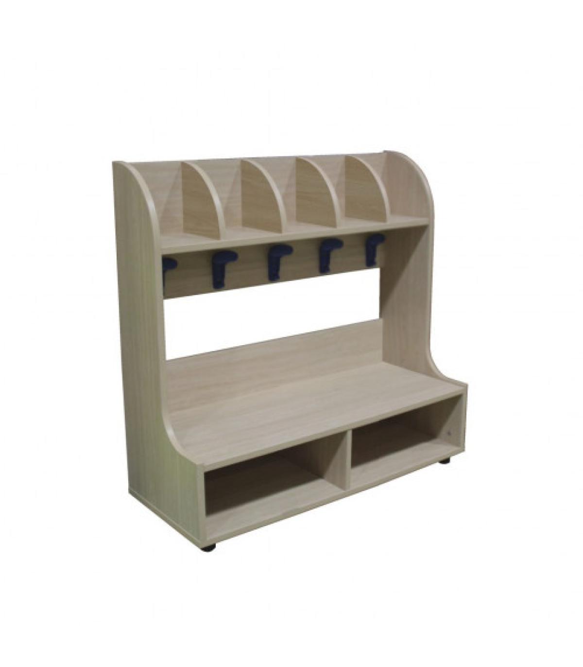 Mueble con banco en la zona inferior y perchero con 5 casillas en la zona superior, fabricado en melamina de haya, con tableros de 19 mm de espesor y con cantos en PVC de 2 mm. Acabado por las dos caras. Dispone de 5 perchas fabricadas en polipropileno con aristas redondeadas y sistema doble colgador, para poder colgar la vestimenta del niño. Pies niveladores de PVC de 4 cm de altura, para evitar la humedad y desniveles que pueda tener el suelo.Garantizado por los ensayos realizados en centro tecnológico de certificación de mobiliario TECNALIA.
