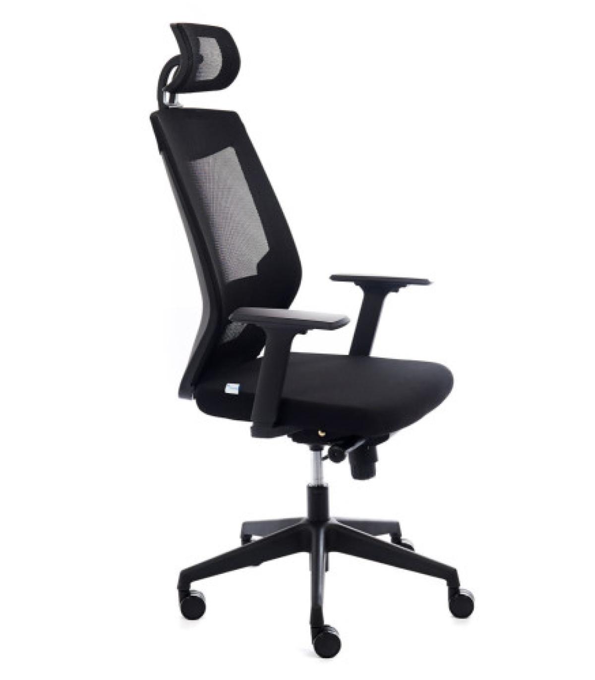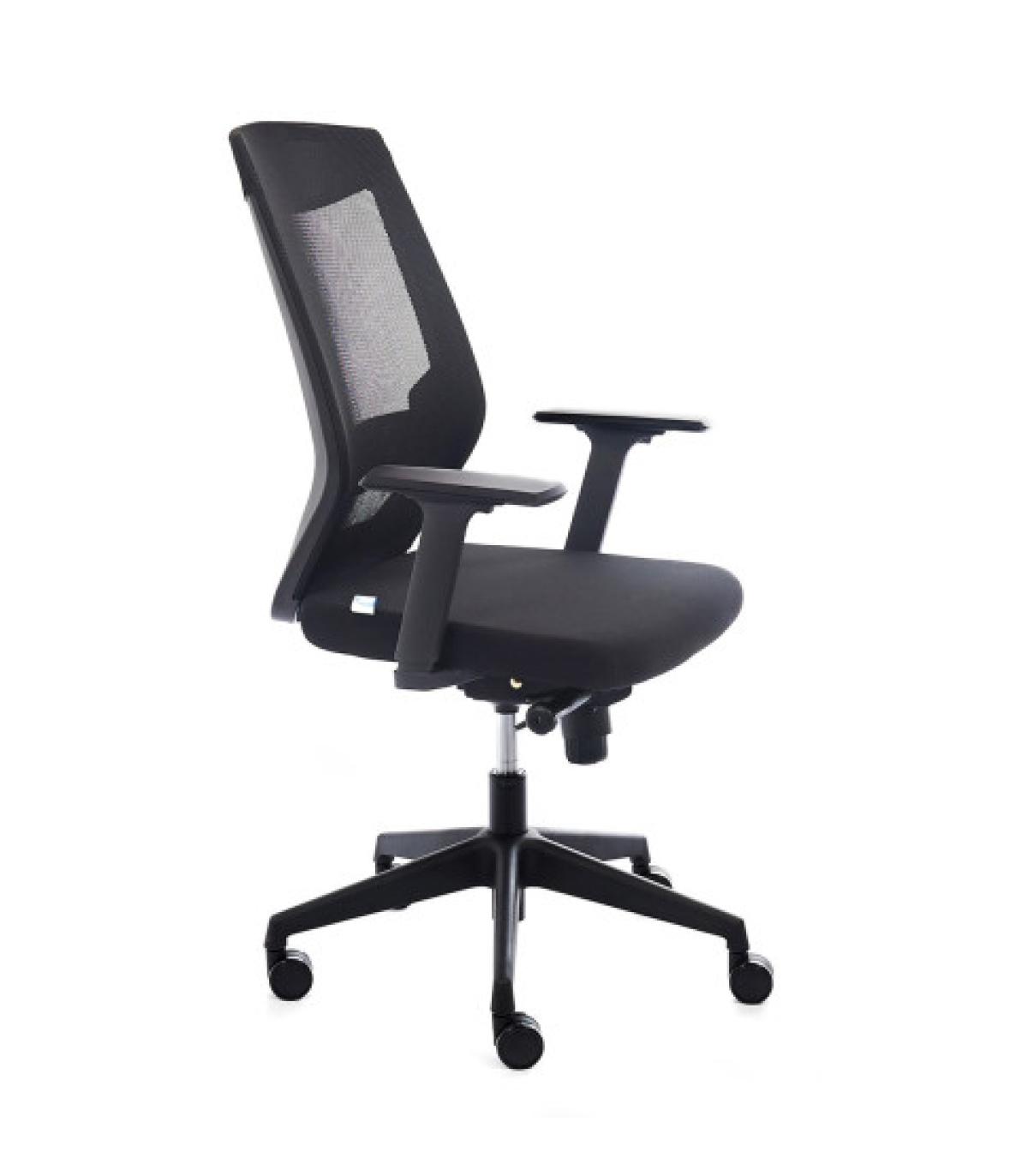 Silla de oficina con el asiento tapizado en tela ignífuga sobre interior de espuma inyectada. Asiento regulable en altura mediante pistón de gas. Respaldo tapizado en malla negra transpirable con soporte lumbar para adaptar el respaldo a la curvatura de la espalda y evitar dolencias. Sistema sincro de inclinación del respaldo con palanca de bloqueo del recorrido en cualquier punto. Pomo para la regulación de la tensión al inclinar el respaldo. Base de polímero técnico de gran resistencia y estabilidad. Brazos de serie regulables en altura. Recomendada para 8h de trabajo y un peso máximo de 125kg. Admite montaje del cabecero (venta opcional Ref. 1351086 P/N 908HR). Fácil montaje.