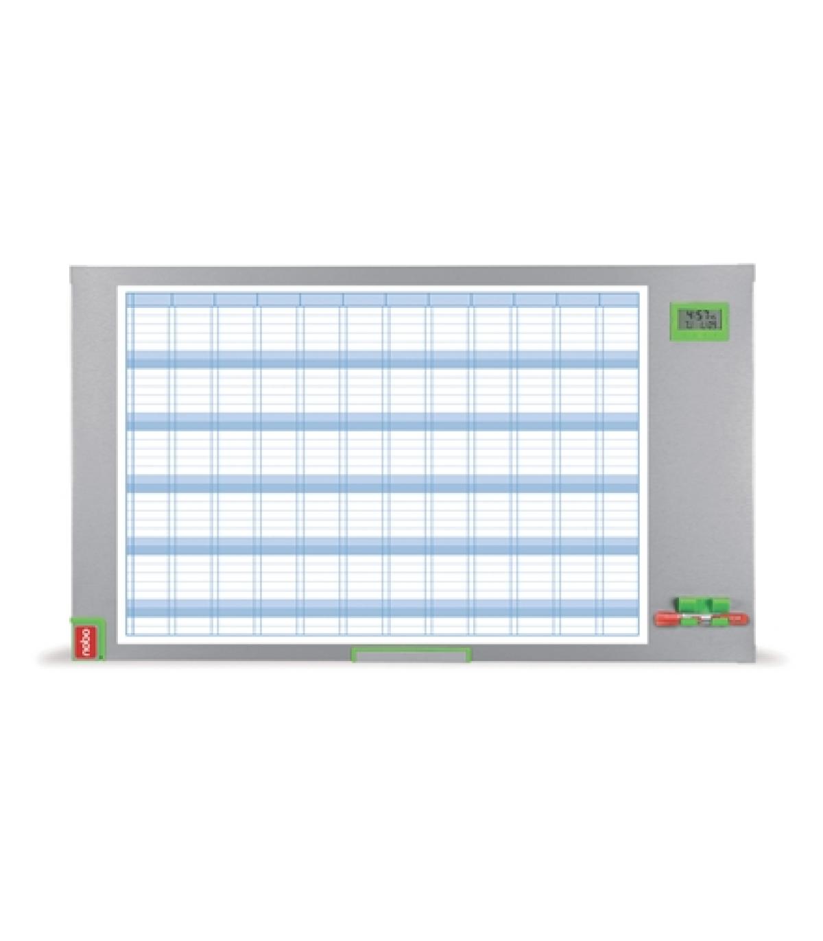 Las pizarras de planificación Performance Plus de Nobo no tienen fecha y cuentan con una superficie magnética de borrado en seco que facilita su actualización. Cuenta con una práctica pantalla que muestra la hora y la fecha. Sección de borrado en seco para notas en los laterales. Borrador magnético integrado para correcciones. Compartimento inferior para tener los rotuladores y otros accesorios a mano. Acabado de acero inoxidable con un elegante efecto de pintura. Estructura ligera de acero para facilitar la instalación. Se suministra con rotuladores de borrado en seco ProStyle de Nobo y un kit de planificación de imanes.