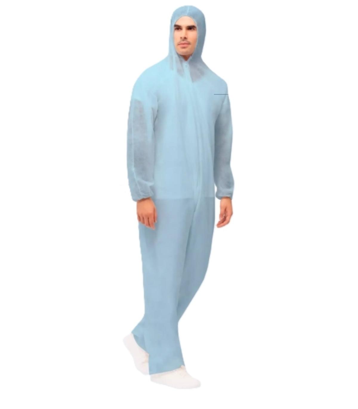 Traje de mono de un solo uso con capucha en polipropileno no tejido (40 ± 5gsm). Con cremallera y elásticos para su mejor ajuste en color azul. Ligero, de material económico y resistente a la suciedad. No pierde fibras. Sin bolsillos.